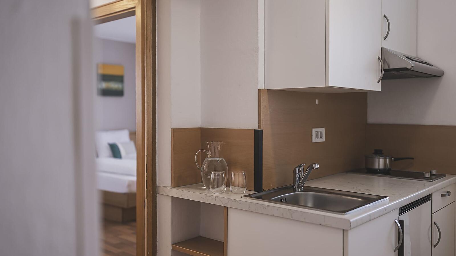 Das Appartement verfügt über eine kleine Kochnische, Badezimmer mit Dusche, Bidet und Pflegeprodukten von Rituals. Das Appartement befindet sich im Hochparterre.