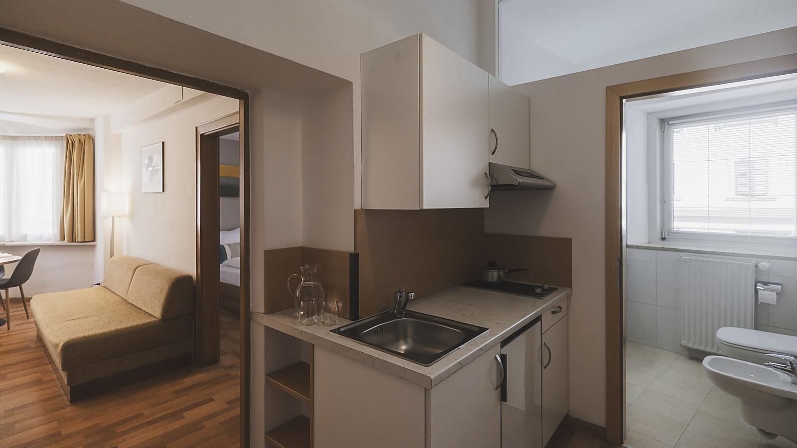 The separate living area with a dining nook offers a view of the pedestrian zone and the historic city center of Brixen. Two separate sofa beds provide space for up to 4 people. The separate bedroom with a cozy seating area invites you to relax.